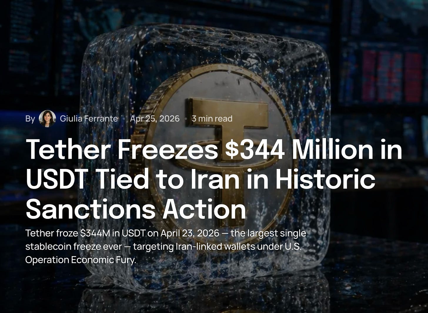 On April 23, 2026, Tether froze $344 million in USDT across two Tron wallets, the largest single stablecoin freeze in the company’s history, executed at the request of US authorities under Operation Economic Fury. US officials confirmed the wallets had material links to the Iranian regime, including transactions with Iranian exchanges and addresses connected to the Central Bank of Iran.